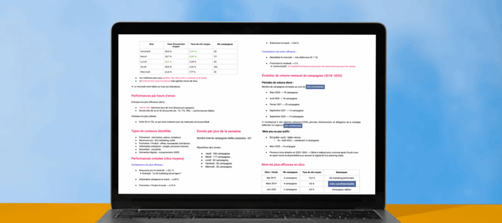 ◾Lecture critique des KPI : nous ne nous contentons pas de taux d’ouverture ou de clics. Nous explorons la qualité des audiences, l’impact du contexte, les doublons, les hard bounces, l’usure des prospects.